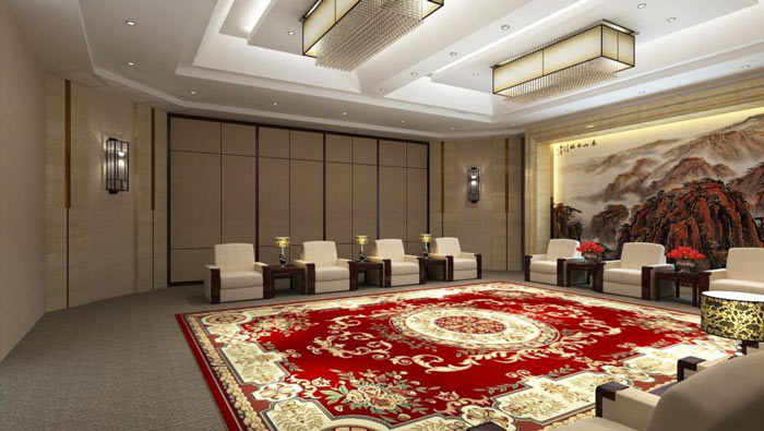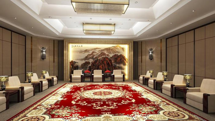 政府辦公室中式接待室裝修:地面鋪設(shè)中式地毯,使的整個(gè)空間沉穩(wěn)、大氣,這樣的設(shè)計(jì)使整體空間,具有鮮明的中國文化特色、及地域特色。