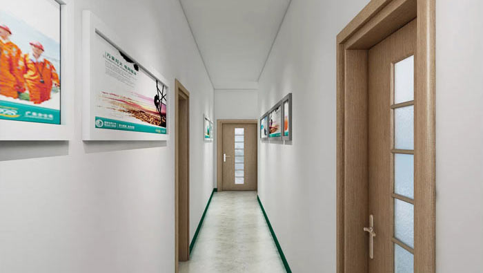 國(guó)家電網(wǎng)辦公室過道裝修:白色的墻體、木色的門框、綠色的踢腳線、墻體畫像的點(diǎn)綴,一切的一切是為了讓過道更加簡(jiǎn)單、便捷。