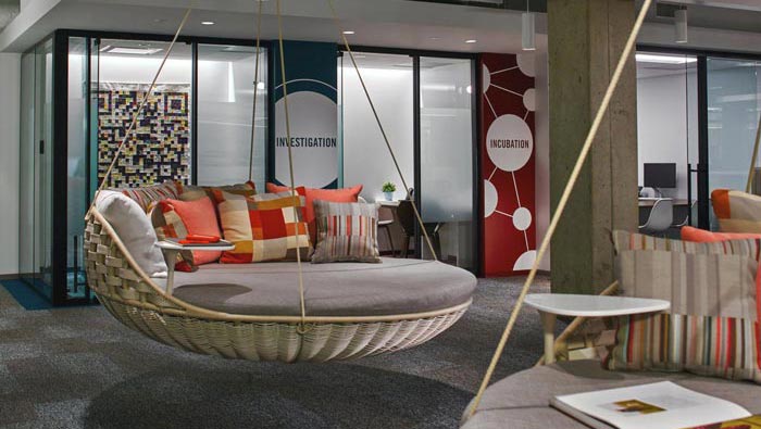 創(chuàng)意區(qū)域的設計:相信大家每個人小時候都蕩過秋千,但是事與愿違,隨著年齡的成長,這些反而很多人都不曾在接觸過,在設計師看來這樣是不對的,我們的成長不能抹殺我們的童心,而且設計師也相信當人在半空中搖晃的時候,往往創(chuàng)意的火花會蹦擦出來。