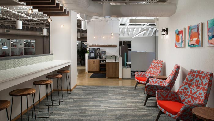 700平方辦公室吧臺設(shè)計(jì):在這里員工們泡上一杯咖啡,坐在吧臺前慢悠悠的品嘗著,生活好不悠閑,這也是設(shè)計(jì)師給員工的一個(gè)福利,經(jīng)過設(shè)計(jì)師的實(shí)踐,設(shè)計(jì)師發(fā)現(xiàn)慢悠悠的生活可以促進(jìn)人的思維提升,在慢悠悠的生活中靈感也比平時(shí)要來得快,這樣的生活向我們闡述了什么是真正的勞逸結(jié)合。
