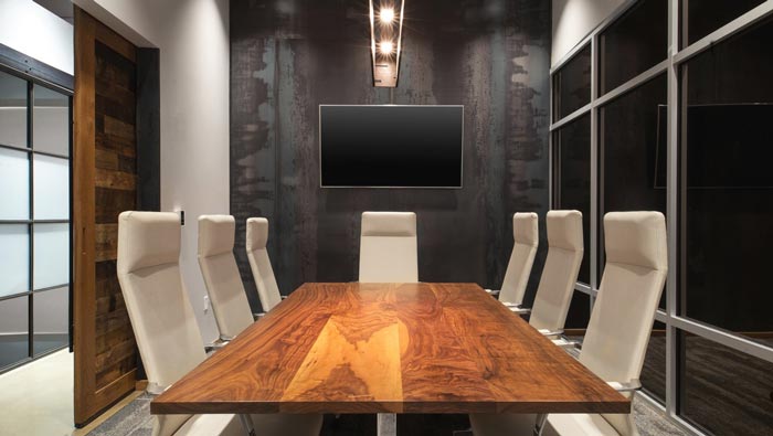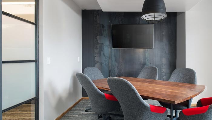 700平方辦公室會議室設(shè)計(jì):此處的空間為長方形格局設(shè)計(jì),設(shè)計(jì)師為了將空間的效果發(fā)揮到最大,故此采用移動(dòng)式的設(shè)計(jì),每一個(gè)會議桌下面有一個(gè)一個(gè)滑輪,合則形成大會議室、分則各自為戰(zhàn),這也是設(shè)計(jì)師對此處的詮釋,同時(shí)此處與落地窗相鄰,白天時(shí)陽光照入室內(nèi),讓整個(gè)空間明亮無比,當(dāng)黑夜襲來的時(shí)候,空間變成了一個(gè)暗色系的空間,不同的情景給以不同的場景。