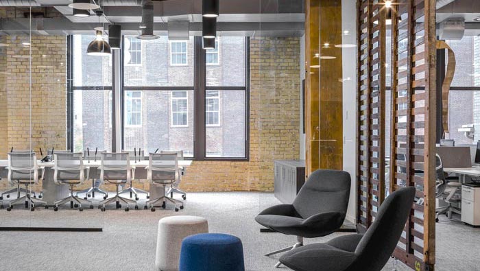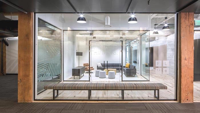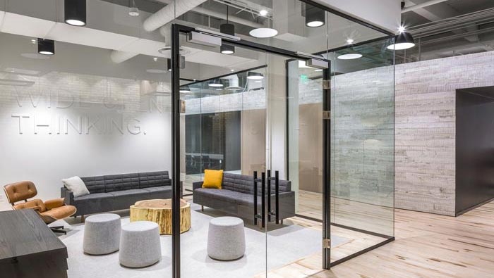 800平方辦公室動(dòng)線設(shè)計(jì):此處給人的第一感覺就是十分明朗,當(dāng)客戶想要直接參觀企業(yè)的時(shí)候,向右轉(zhuǎn)可以直接進(jìn)入室內(nèi),接待區(qū)域本身就是一個(gè)過(guò)渡空間,這樣的布局就是將兩種情況都加以考慮,并再設(shè)計(jì)的時(shí)候加以結(jié)合,在客戶前面想到并解決這個(gè)問(wèn)題,以此保證整個(gè)空間的暢通。