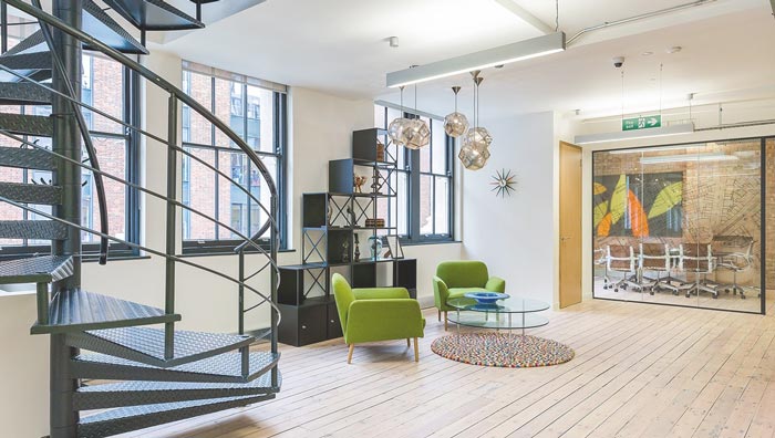 900平方辦公室進門區(qū)設計:當客戶進入空間之后,第一眼看到的就是旋轉(zhuǎn)的樓梯,這樣的樓梯給人一種復古的感覺,但在設計師的設計手法之下,變得是那么的自然,讓空間復古的氛圍更加的自然,接待桌椅的擺放為空間加入了現(xiàn)代的元素,讓空間變得簡約又有韻味。