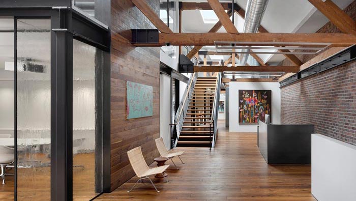 辦公室前臺區(qū)設(shè)計:設(shè)計師將前臺與樓梯結(jié)合在一起,就是希望客戶在經(jīng)過前臺之后,可以直接通過樓梯進入二樓,對空間的大致格局有一個直觀的了解。