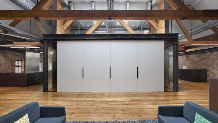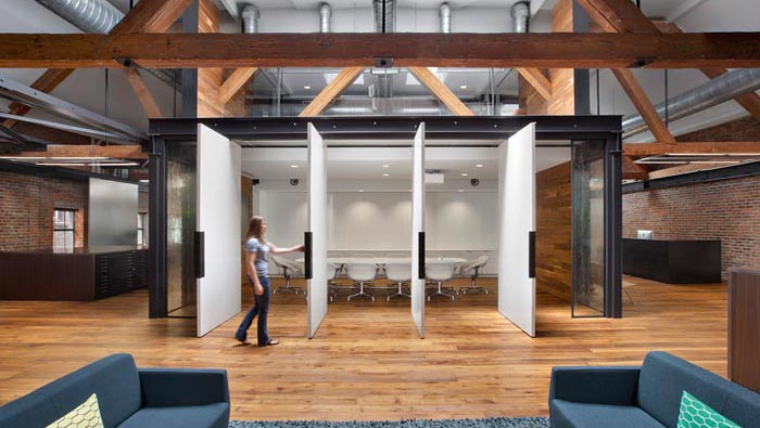 辦公室會議室設(shè)計:當活動門打開以后,會議室展露在大家面前,由此不得不佩服設(shè)計師的想象,這也是設(shè)計師的設(shè)計之道,讓空間活動起來。