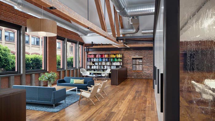 辦公室接待區(qū)設(shè)計:此處保留了紅色磚,歷史的味道充斥在空間之中,讓客戶感受到那逝去的歲月,以此引起與客戶之間的共鳴,書柜的設(shè)計在空間盡顯書香氣息。