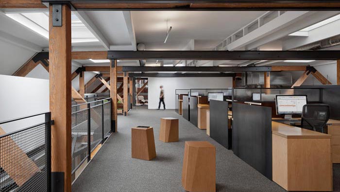 辦公室二樓過道設(shè)計:設(shè)計師在設(shè)計中受到軟裝便捷的啟發(fā),采用獨立座椅,擺放在空間之中,既不影響交談,也開辟了一個新的使用空間。