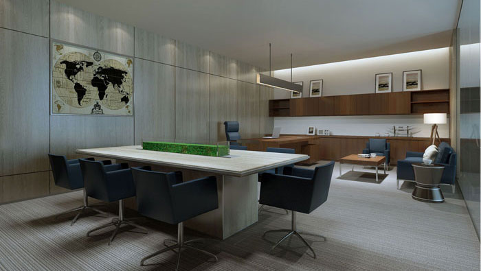 總經(jīng)理辦公室的設(shè)計(jì),設(shè)計(jì)師根據(jù)與總經(jīng)理本人的交流,了解到總經(jīng)理本人喜歡清靜,另外希望可以將空間加入小型會議室,最后設(shè)計(jì)師將會議室與辦公室完美的結(jié)合在一起。