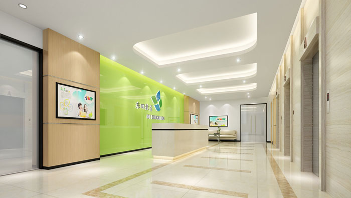 前臺的設(shè)計(jì),設(shè)計(jì)師采用大幅度淺綠色做為背景色,淺綠色是明亮、淡雅的顏色,淺綠色充滿了生命力的色彩,表現(xiàn)了萌芽發(fā)展初期時(shí)候的色彩,在此處表示教育啟蒙是在合適不過了。