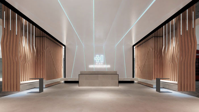 在前廳的設(shè)計過程中,設(shè)計師認(rèn)為前廳作為顧客進門的第一視覺,所以在設(shè)計的時候設(shè)計師利用光纖與折疊木條進行設(shè)計,這樣就可以將企業(yè)的核心得以展現(xiàn)。