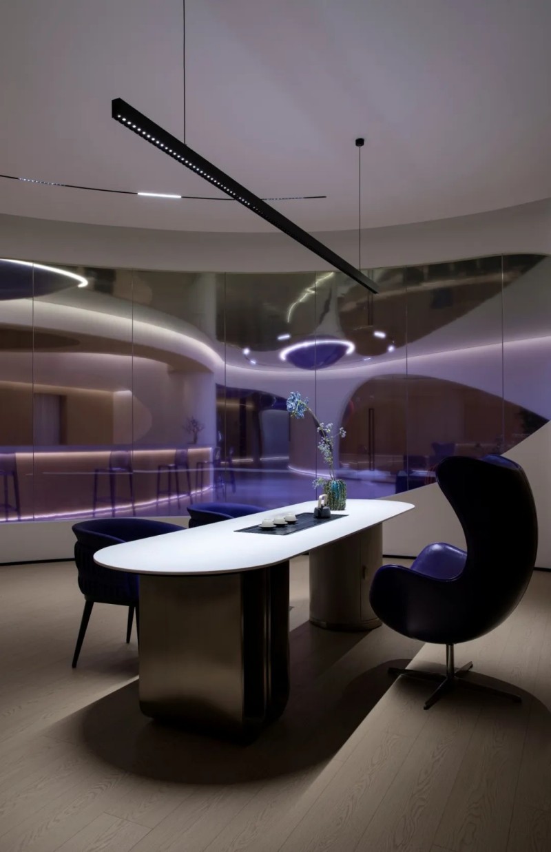 整個空間選擇了蒼藍為主色,靈感來源于對葉博士沉著和冷靜的第一印象。設計師覺得,這是符合對方氣質(zhì)的空間色彩。也因為在廈門這個海濱城市,蒼藍是海天一色交融時獨有的一道藍紫色。