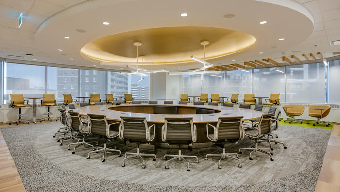 會(huì)議室效果圖:圓形的會(huì)議桌椅占據(jù)了空間的中心區(qū)域,將空間的中心完美的使用起來,外環(huán)設(shè)計(jì)師利用吧臺(tái)桌椅搭建一個(gè)環(huán)形的座椅,以此加大會(huì)議室的實(shí)用率。