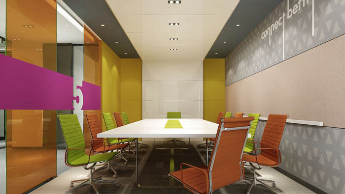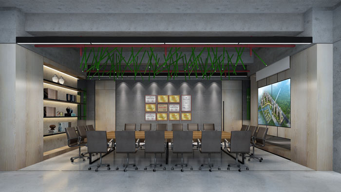 會(huì)議室效果圖:空間的一邊為落地窗,這也是設(shè)計(jì)師選擇此處為會(huì)議室的重要原因,設(shè)計(jì)師希望可以借助外界的景色,沖淡會(huì)議中的乏味,讓大家可以群力群策。