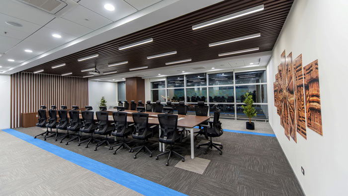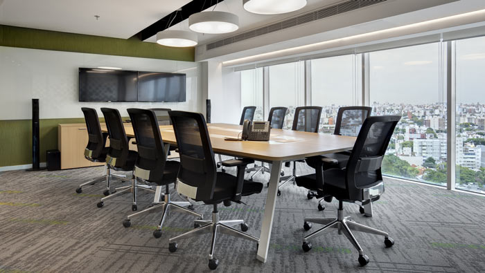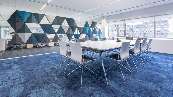 辦公會(huì)議室裝修效果圖:由顏色框定的會(huì)議空間,正是設(shè)計(jì)師為企業(yè)專門(mén)定制的,這樣可以減少隔墻對(duì)空間的影響,斜放的會(huì)議桌椅,讓空間不會(huì)那么呆板。