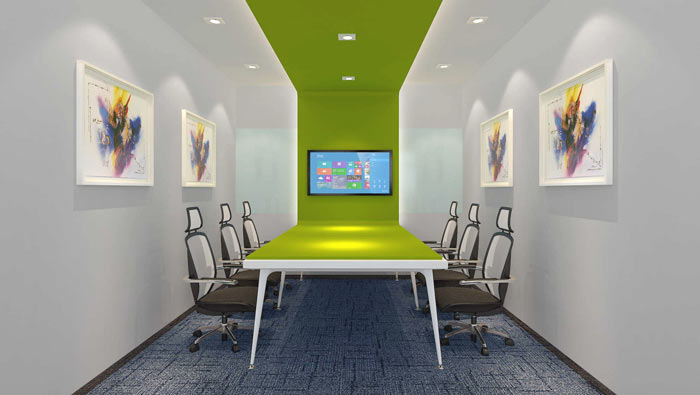 會議室裝修設(shè)計效果圖:白色、綠色做為空間的主要構(gòu)成元素,白色讓空間簡潔、高端,綠色讓空間自然、舒適,這也正是設(shè)計師希望看到的,設(shè)計師注重空間與個人之間的平衡。