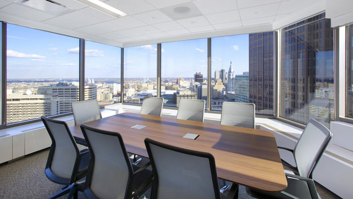 會議室裝修設(shè)計效果圖:明亮、大氣是整個空間的基本元素,在這里可以俯視整座城市,在彼此交流的過程中,沒有想法的時候可以往外看看,在冷靜的同時得到啟發(fā)。