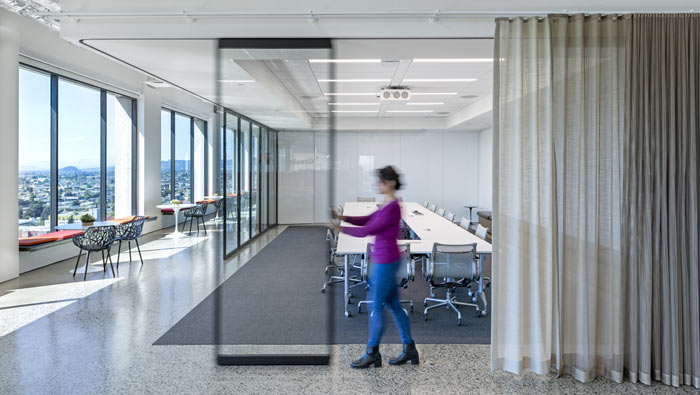 會議室裝修設(shè)計效果圖:推拉門是開放性空間的一把鑰匙,推開時整個空間融為一體,合上瞬間成為兩個不同區(qū)域,一個會議室、一個休息區(qū),合與分的魅力在此展現(xiàn)無疑。