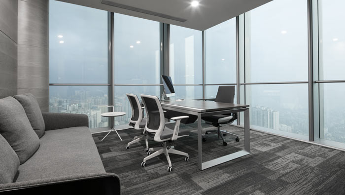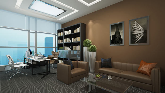 總經(jīng)理辦公室設(shè)計(jì):整個(gè)空間三面都是落地窗,將城市的美景、自然的美景很好的映入眼簾,在這里工作讓總經(jīng)理脫離了鋼筋水泥的牢籠,讓其仿佛位于自然之中。