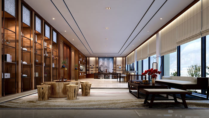 總經(jīng)理辦公室設(shè)計(jì):自然是整個(gè)空間設(shè)計(jì)的主題,落地窗將自然光源引入室內(nèi),墻面上的山水畫將自然中的山水拓展到空間之中,讓自然在這里匯聚。