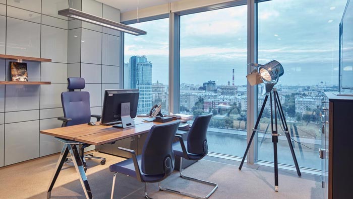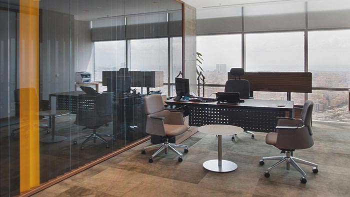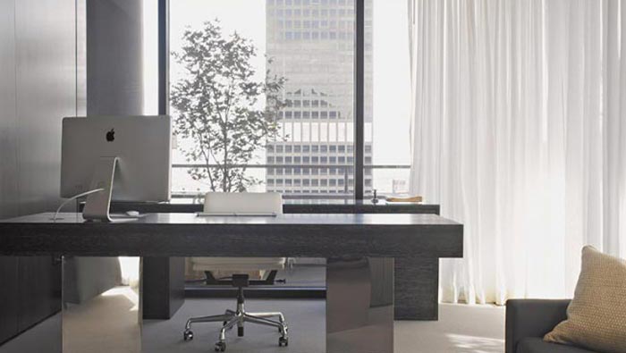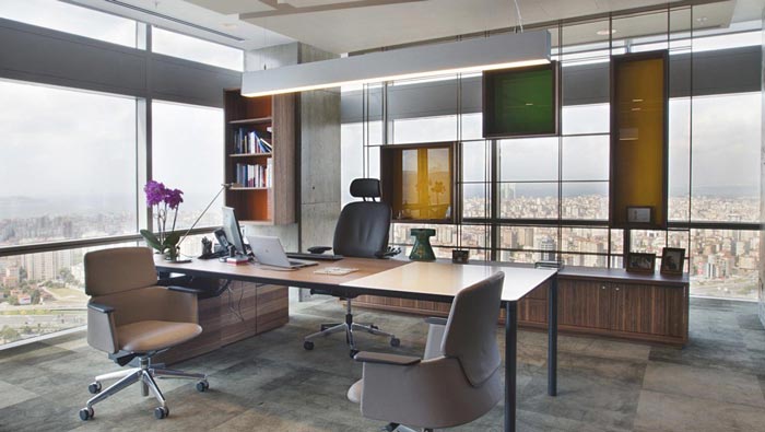 老總辦公室設計:此空間給人的第一感覺就是明亮與大氣,戶外美麗的城市風光也盡收眼底,讓人的心情不自覺的開心起來,這樣的設計對于老總本身有很大的裨益。