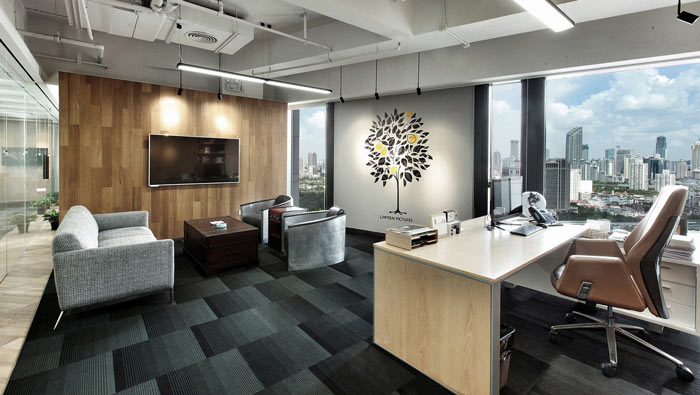 老總辦公室設計:老總本人在思考問題的時候喜歡踱步,這也就是此處設計的初衷,辦公室因為有靠椅所以讓老總背后有靠山,靠背后面是城市,寓意著整個城市支撐著企業(yè)的發(fā)展。